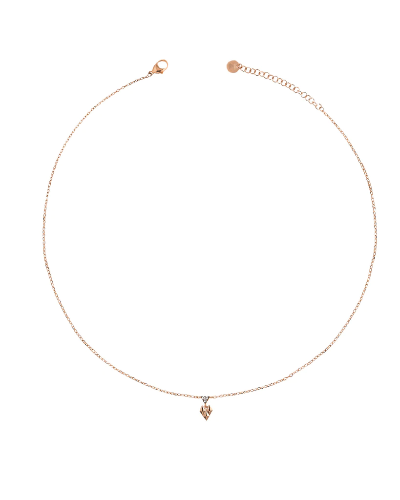 Collana girocollo della collezione Rue Des Mille Stardust Magnetica da donna. Colore: oro rosa. Il gioiello è in argento 925% con finitura in oro rosa 18kt e soggetto centrale mini cuore matto e triangolo di zirconi. Lunghezza: 37 cm + estensione 4 cm. Chiusura a moschettone.